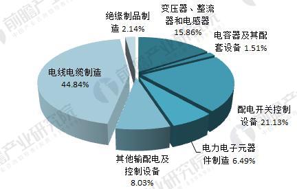 资料来源:前瞻产业研究院整理 输配电设备行业产业链介绍 按照细分市场来看,我国输配电设备包含电线电缆制造,绝缘制品制造、电力电子元器件制造等制造行业。同时包含变压器、整流器和电感器,电容器及其配套设备,配电开关控制设备,其他输配电及控制设备行业。按照各细分行业2016年的市场规模看,电线电缆制造的收入占比最高为44.84%,其次为配电开关控制设备市场规模占比为21.13%;变压器、整流器和电感器市场规模占比为15.86%。细分行业市场规模不仅受到产品市场价格的影响,同时下游的需求规模和产品更新换代的速度都是行业市场规模的主要影响因素。 图表3:2016年输配电设备产品机构分析(单位:%)