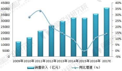 资料来源:前瞻产业研究院整理 需求推动:行业规模不断扩大 近年来,输配电设备市场需求总体呈上升趋势,随着农网改造、特高压、超高压直流输电等工程的建设,带动了我国输配电设备市场的快速发展。据前瞻产业研究院发布的《输配电设备行业产销需求与投资预测分析报告》数据显示,输配电设备销售收入由2009年代为1.26万亿元,增长至2016年的3.59万亿元,实现了近3倍的规模增长。结合游转型升级和需求的不断增加,前瞻估算2017年输配电设备行业收入规模超过4万亿元。 图表2:2009-2017年输配电设备销售规模及增速(单位:亿元,%)