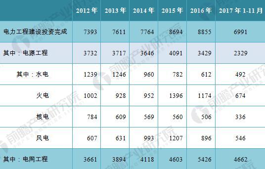 资料来源:前瞻产业研究院整理 需求不断增加:市场规模前景看好 从某种程度上讲,输配电设备市场的需求动向取决于下游电力市场的发展。电网行业作为输配电设备下游的主要需求方,其投资规模的增加和项目建设的推广将有效的促进输配电设备需求量的增加。2012-2016年,全国电力工程投资规模不断增加,至2016年电力工程完成投资额为8855亿元,其中电网工程完成投资规模为5426亿元,占全年投资完成额的61.28%,2012-2016年电网工程投资维持了10%以上的年均增长速度。2017年1-11月,电网工程投资额为4662亿元。 图表4:2012-2017年全国电力工程建设完成投资额(单位:亿元)