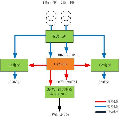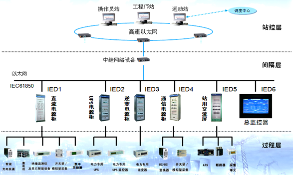智能一体化电源系统由交流电源、直流电源、交流不间断电源、通信用直流变换、逆变电源、总监控单元组成; 直流电源、交流不间断电源(UPS)、逆变电源(INV)、通信用直流变换器(DC/DC)共享同一组蓄电池,减少了蓄电池组数量,降低了运维及管理成本;总监控单元对各电源子系统实行集中监视、分散控制,提高了一体化电源系统的管理水平。